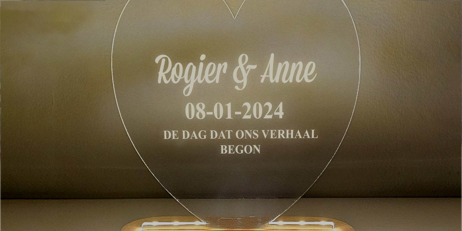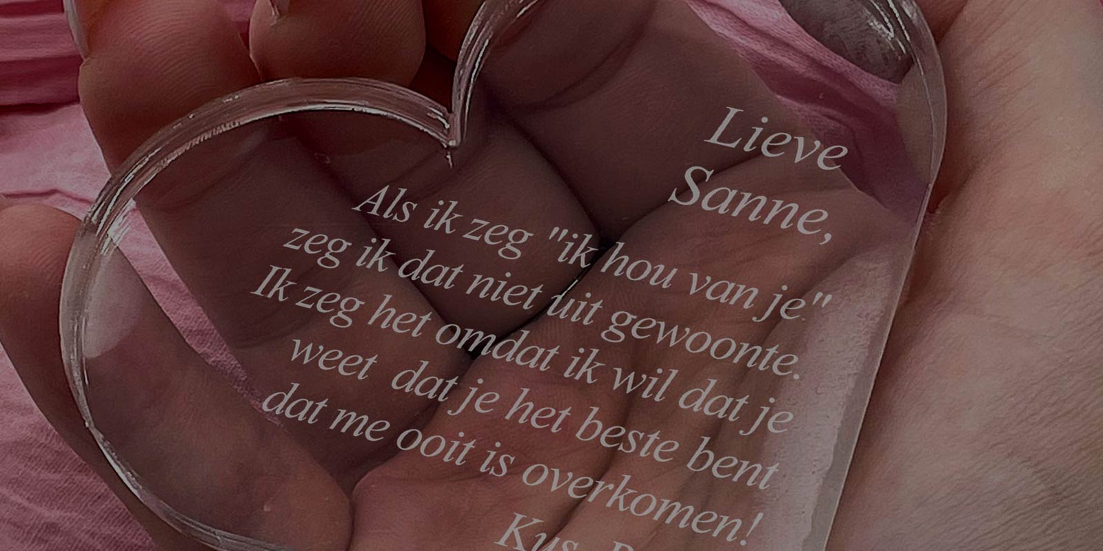 In principe kunnen we alle materialen graveren. zelfs staal! Wij bieden inmiddels een breed scala aan speciale producten die je niet overal vindt. Van Gegraveerde glazen harten, tot armbanden tot op maat gesneden Plexiglas raampjes met eigen tekst, niets is voor ons te gek. Dagelijks is ons team op zoek naar niet alledaagse items om te maken. Items die je niet zomaar in de winkel vindt, maar alleen bij ons online. Mocht je een suggestie of speciaal verzoek hebben, twijfel dan niet om ons dit toe te sturen.