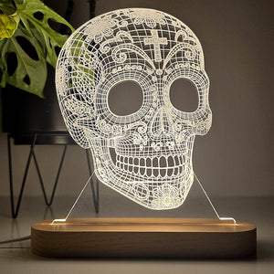 De gedetailleerde schedel is met uiterste precisie gegraveerd in hoogwaardig plexiglas, wat zorgt voor een verbluffend optisch effect zodra de ledlamp aan gaat.