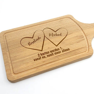 Deze Gegraveerde Hapjesplank is een echte eye-catcher. Wij gebruiken alleen hoogwaardig Europees hout. Elke hapjesplank wordt vooraf behandeld, waardoor het niet kromtrekt door vocht of temperatuurwisselingen. Deze borrelplank is zowel geschikt om op te snijden als te serveren.