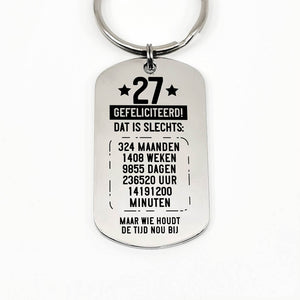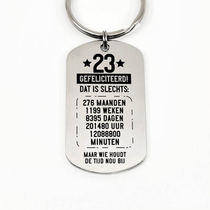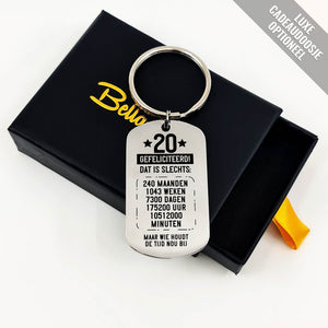RVS sleutelhanger voor 20e tot en met 29ste verjaardag. Leeftijd in jaren, maanden, weken, dagen, uren en minuten.