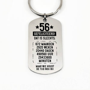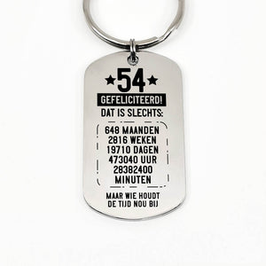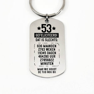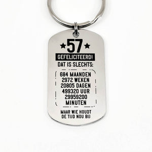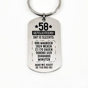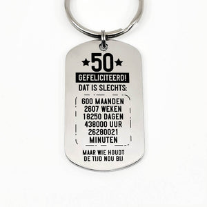 RVS sleutelhanger voor 50e tot en met 59e verjaardag. Leeftijd in jaren, maanden, weken, dagen, uren en minuten.