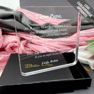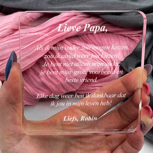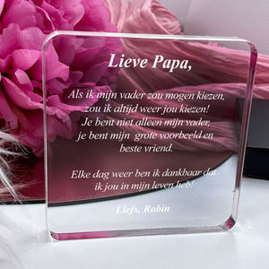 Doe vandaag nog een prachtig plexiglas Aandenken met persoonlijke boodschap cadeau. Lasergegraveerd met eigen namen en een dikte van 1 cm.