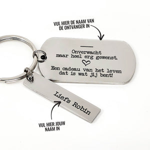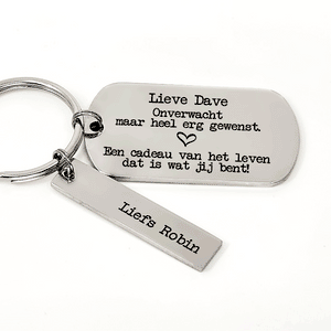 ... Onverwacht maar heel erg gewenst Sleutelhanger. Op veler verzoek is het nu mogelijk om ook een eigen tekst op de dogtag te zetten. Wie ga jij verrassen met deze unieke gepersonaliseerde sleutelhanger?