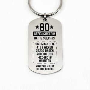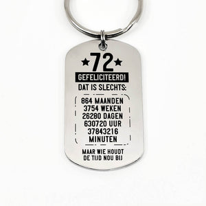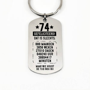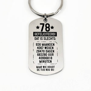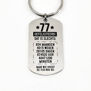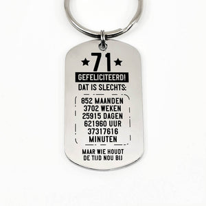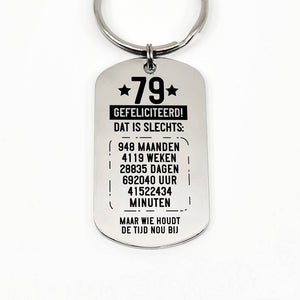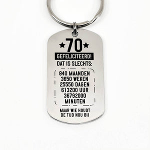 RVS sleutelhanger voor 70e tot en met 79ste verjaardag. Leeftijd in jaren, maanden, weken, dagen, uren en minuten.