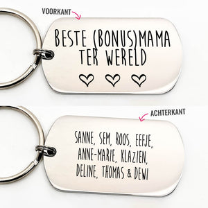 Ze heeft niet jou ogen of jou glimlach maar vanaf het begin had ze jou hart. Jou bonus mama heeft er voor gekozen om van jou te houden en dit doet ze! Veras haar daarom met deze handgemaakte "Beste (Bonus)mama ter wereld" RVS sleutelhanger. Je kunt de sleutelhanger personaliseren door er namen aan toe te voegen. Zeker weten een prachtig cadeau