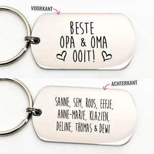 Zeg jij ook te weinig tegen jouw opa & oma dat je ze de beste ooit vind? Doe dat nu door deze originele 'beste opa&oma ooit!' sleutelhanger cadeau te geven. We garanderen een zekere glimlach bij ontvangst! Je kunt deze RVS sleutelhanger personaliseren door er jouw naam en die van de rest van de kleinkinderen aan toe te voegen.