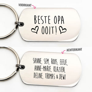 Opa's ze zijn er in vele soorten en maten. Maar die van jou is de beste! Laat hem met deze mooie handgemaakte RVS sleutelhanger weten dat je van hem houd. De sleutelhanger is te personaliseren met de namen van Opa's kleinkinderen.