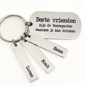 Kun jij alles kwijt bij jou vrienden onder het genot van een drankje? Verras dan jouw beste vrienden met deze mooie handgemaakte 'Beste vrienden zijn de therapeuten waarmee je kan drinken' RVS Sleutelhanger. Je kan hem zelfs personaliseren met jullie namen!