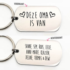 Bij oma kan je altijd terecht, voor een dikke knuffel of een gezellig praatje, maakt niet uit. Jouw oma is er. Laat haar weten dat je van haar houd en geef haar nu dit originele 'Deze oma is van' sleutelhanger cadeau. Je kunt de sleutelhanger personaliseren door al haar kleinkinderen er op te zetten.
