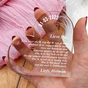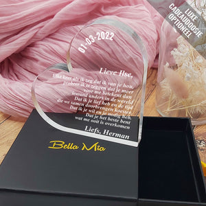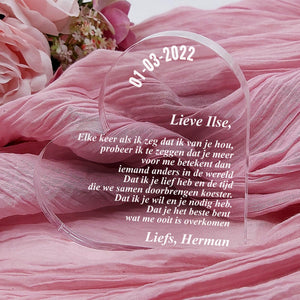 Doe vandaag nog een prachtig plexiglas hart met persoonlijke boodschap cadeau. Lasergegraveerd met eigen namen en een dikte van 1 cm.