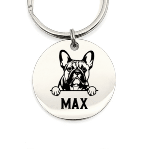 Zet op de puntjes (bijvoorbeeld de naam van je Franse Bulldog) op het rondje en personaliseer daarmee deze mooie sleutelhanger