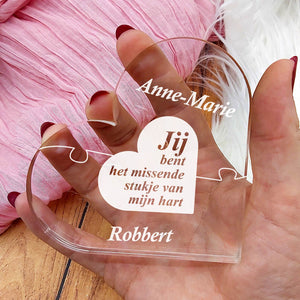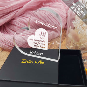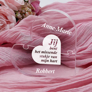 Doe vandaag nog een prachtig plexiglas hart met persoonlijke boodschap cadeau. Lasergegraveerd met eigen namen en een dikte van 1 cm.