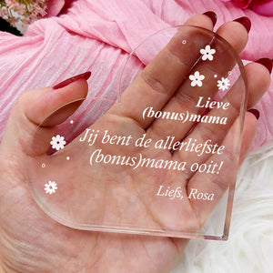 Willen jullie bonusmama laten weten dat jullie zo ontzettend van haar houden? Geef bonusmama nu deze prachtige boodschap op een glazen hart cadeau! Je kunt de hart personaliseren door er jullie naam aan toe te voegen.