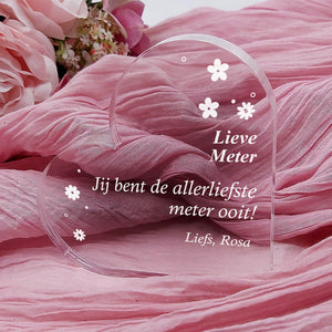Zo'n lieve meter als die jij hebt is er één uit duizenden! Laat haar weten hoe je over haar denkt en geef haar nu deze originele glazen hart cadeau. Je kunt deze hart personaliseren door er zelf de namen aan toe te voegen.