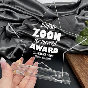 Zet jullie zoon dit jaar in het zonnetje met zijn eigen award van plexiglas. Compleet gepersonaliseerd met namen van zijn mama en papa. Een uniek cadeau!