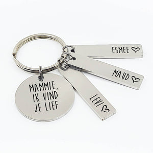 Met dit cadeau kan je je mammie ontzettend gelukkig maken. Geef haar nu deze unieke 'Mammie ik vind je lief' sleutelhanger en personaliseer deze door er jouw naam en van de rest van het gezin er aan toe te voegen! Het is toch hartstikke leuk dat ze jullie altijd bij zich zou kunnen dragen?