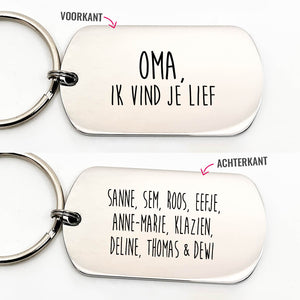 Bij oma kan je altijd terecht, voor een dikke knuffel of een gezellig praatje, maakt niet uit. Jouw oma is er. Laat haar weten dat je haar Lief vind en geef haar nu dit originele 'Oma ik vind je lief' sleutelhanger cadeau. Je kunt de sleutelhanger personaliseren door al haar kleinkinderen er op te zetten.