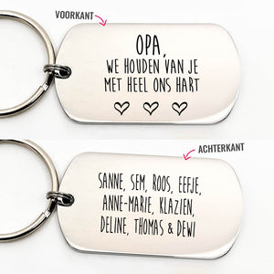 Opa's ze zijn er in vele soorten en maten. Maar die van jou is de liefste! Laat hem met deze mooie handgemaakte 'Opa we houden van je met heel ons hart" RVS sleutelhanger weten dat je van hem houd. De sleutelhanger is te personaliseren met de namen van Opa's kleinkinderen.