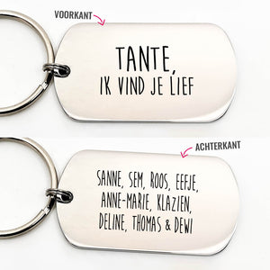 Van alle Tantes in de wereld is er maar één de beste en dat is toevallig wel de jouwe! Geef haar dit unieke 'Tante ik vind je lief' sleutelhanger cadeau met alle namen van haar nichtjes en neefjes! Zo Krijgt ze een prachtig persoonlijk cadeau!
