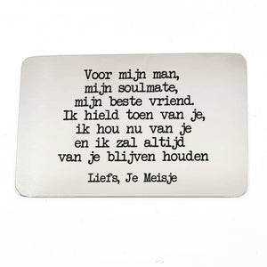 Onze RVS Kaartjes zijn perfect als kaartjes in de portemonnee of als bordje op op een deur. "Voor Mijn Man, Mijn soulmate Stalen Kaartje" is lasergegraveerd met de hand op hoogwaardig RVS-materiaal.