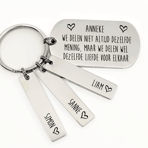 We delen niet altijd de zelfde meningmaar we delen wel dezelfde liefde voor elkaar. Op veler verzoek is het nu mogelijk om ook een eigen tekst op de dogtag te zetten. Wie ga jij verrassen met deze unieke gepersonaliseerde sleutelhanger?