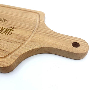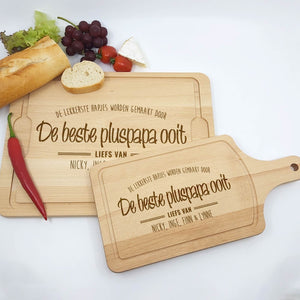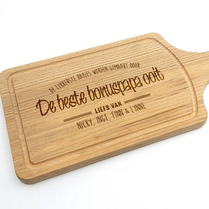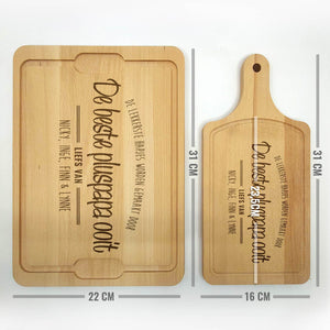 Deze Gegraveerde Hapjesplank is een echte eye-catcher. Wij gebruiken alleen hoogwaardig Europees hout. Elke hapjesplank wordt vooraf behandeld, waardoor het niet kromtrekt door vocht of temperatuurwisselingen. Deze borrelplank is zowel geschikt om op te snijden als te serveren.
