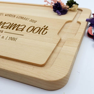 Let op: Hout is een natuurproduct. Hierdoor zal elke gravure iets afwijken van de foto's. Dit komt simpelweg omdat de nerf van het hout bepaald hoe donker de gravure wordt. Dit maakt elke borrelplank wel 100% uniek!