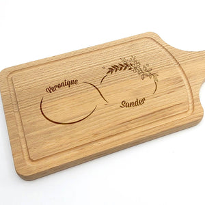 Deze Gegraveerde Hapjesplank is een echte eye-catcher. Wij gebruiken alleen hoogwaardig Europees hout. Elke hapjesplank wordt vooraf behandeld, waardoor het niet kromtrekt door vocht of temperatuurwisselingen. Deze borrelplank is zowel geschikt om op te snijden als te serveren.