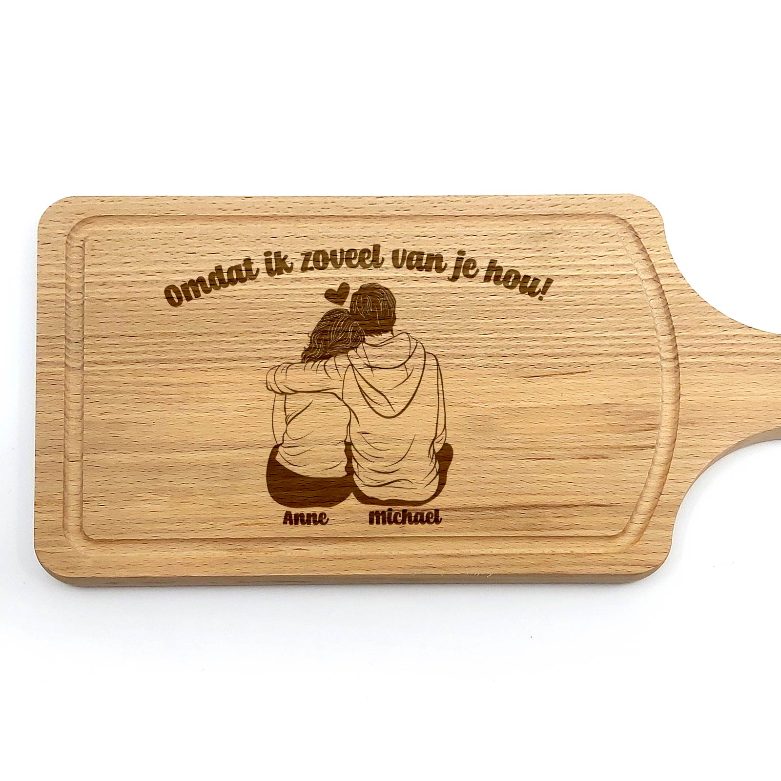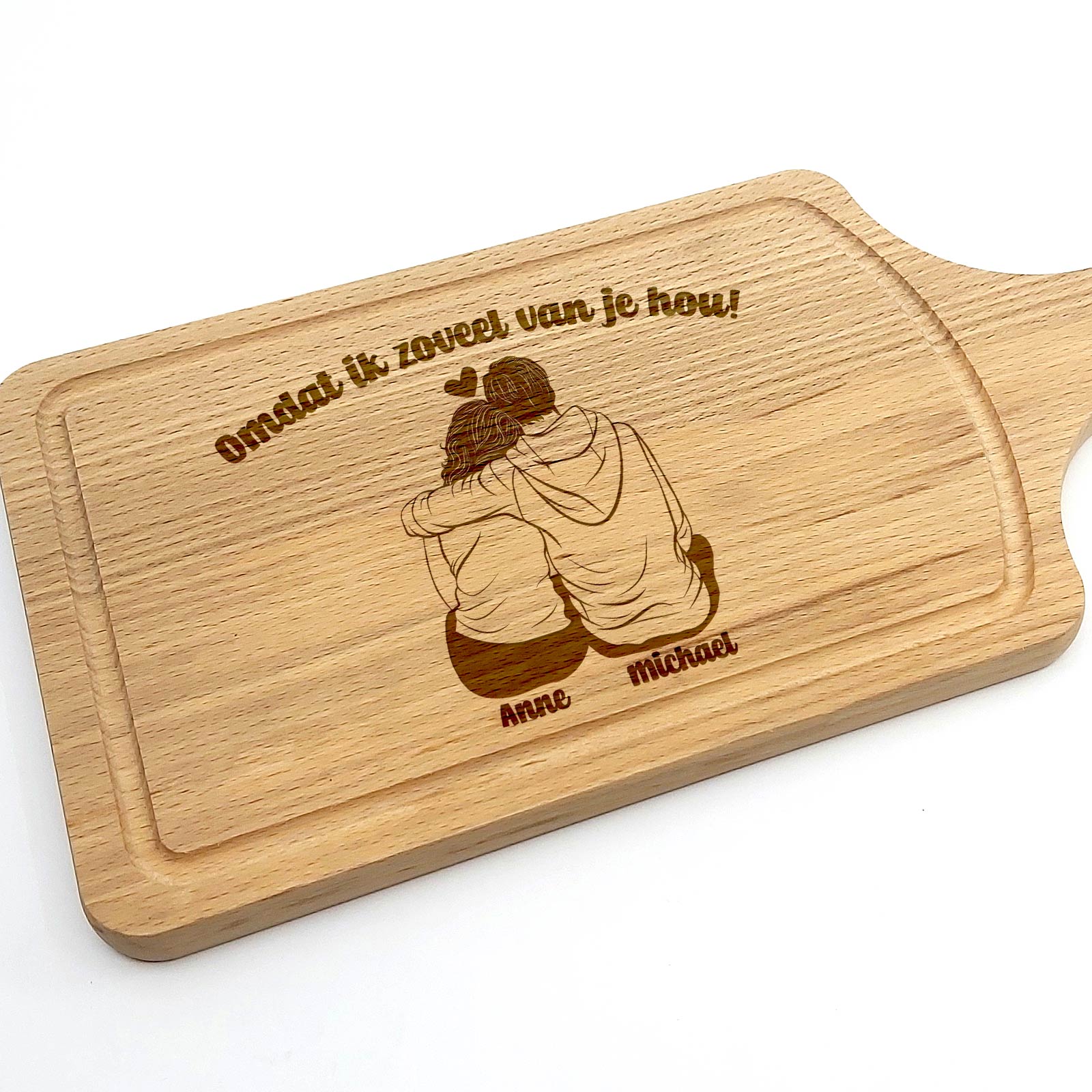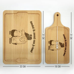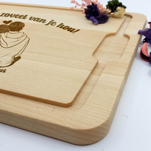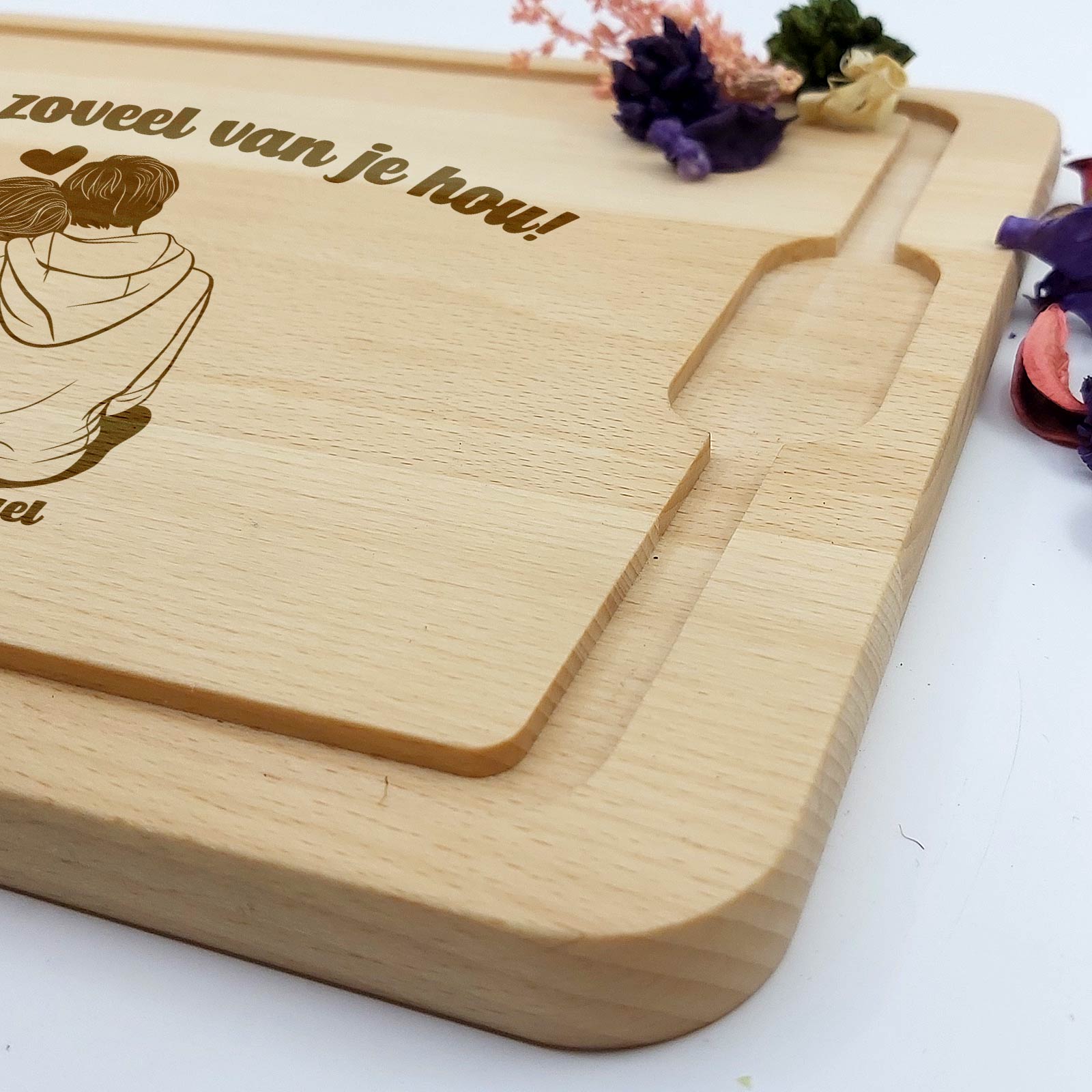 Deze Gegraveerde Hapjesplank is een echte eye-catcher. Wij gebruiken alleen hoogwaardig Europees hout. Elke hapjesplank wordt vooraf behandeld, waardoor het niet kromtrekt door vocht of temperatuurwisselingen. Deze borrelplank is zowel geschikt om op te snijden als te serveren.