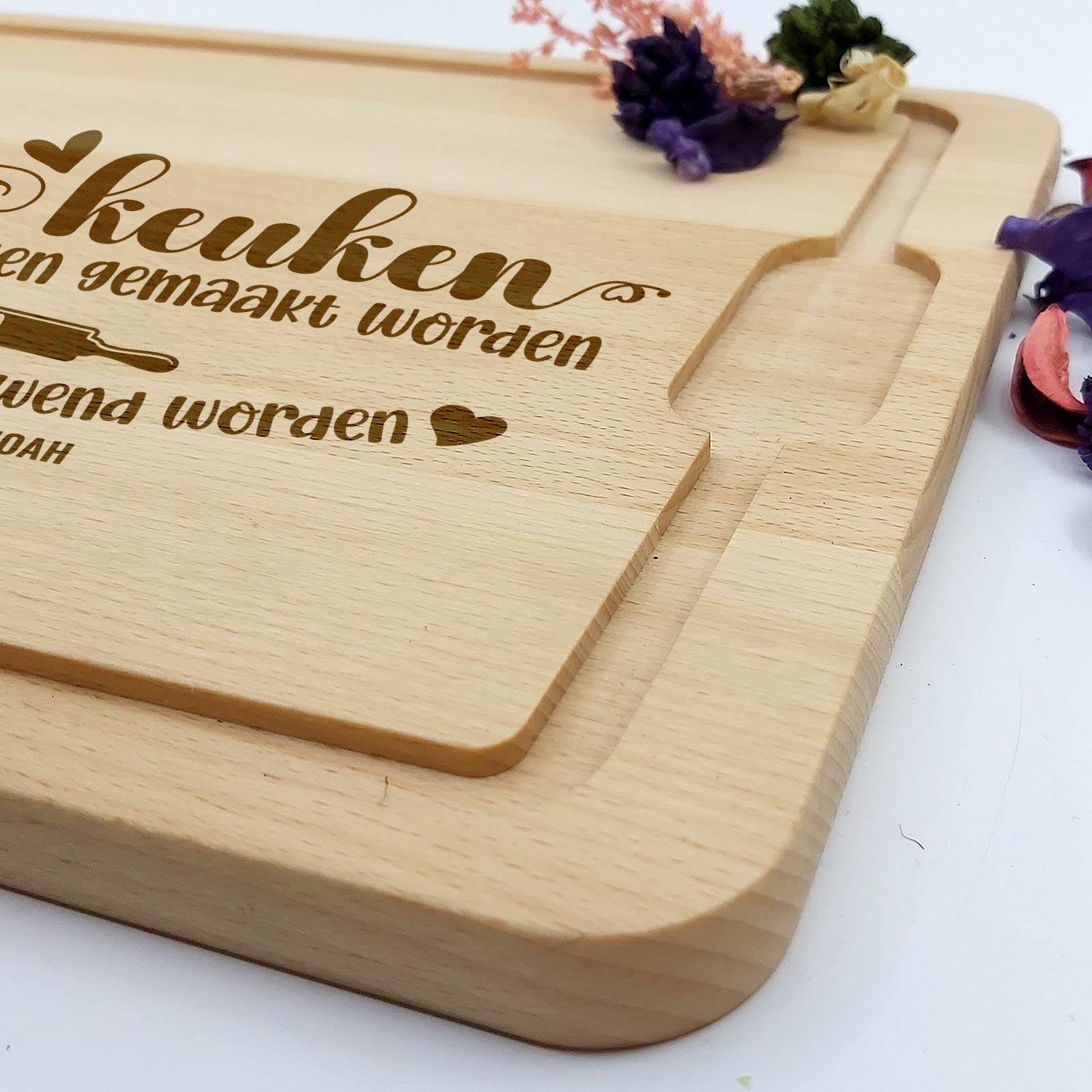 Let op: Hout is een natuurproduct. Hierdoor zal elke gravure iets afwijken van de foto's. Dit komt simpelweg omdat de nerf van het hout bepaald hoe donker de gravure wordt. Dit maakt elke borrelplank wel 100% uniek!