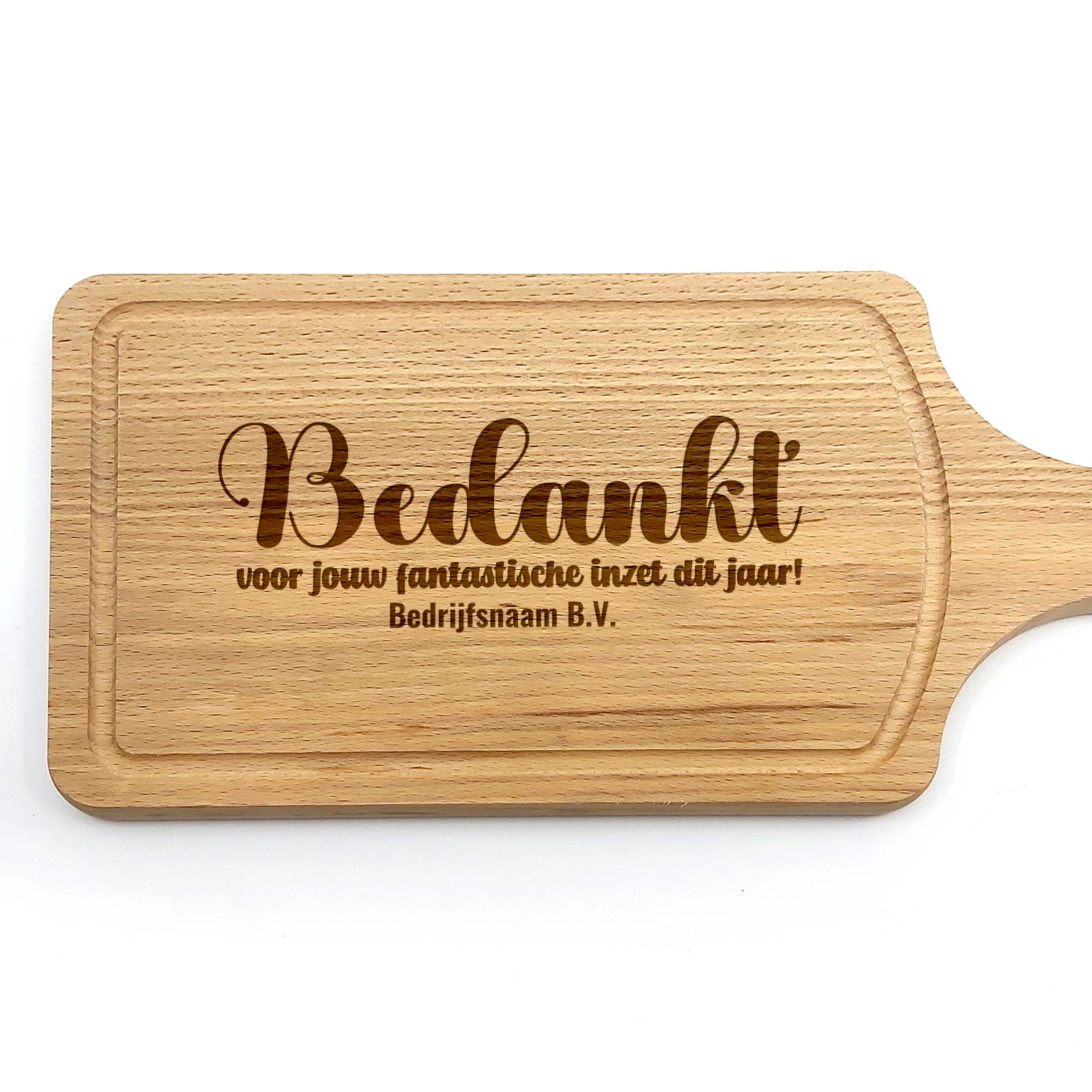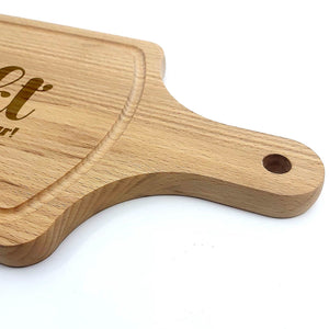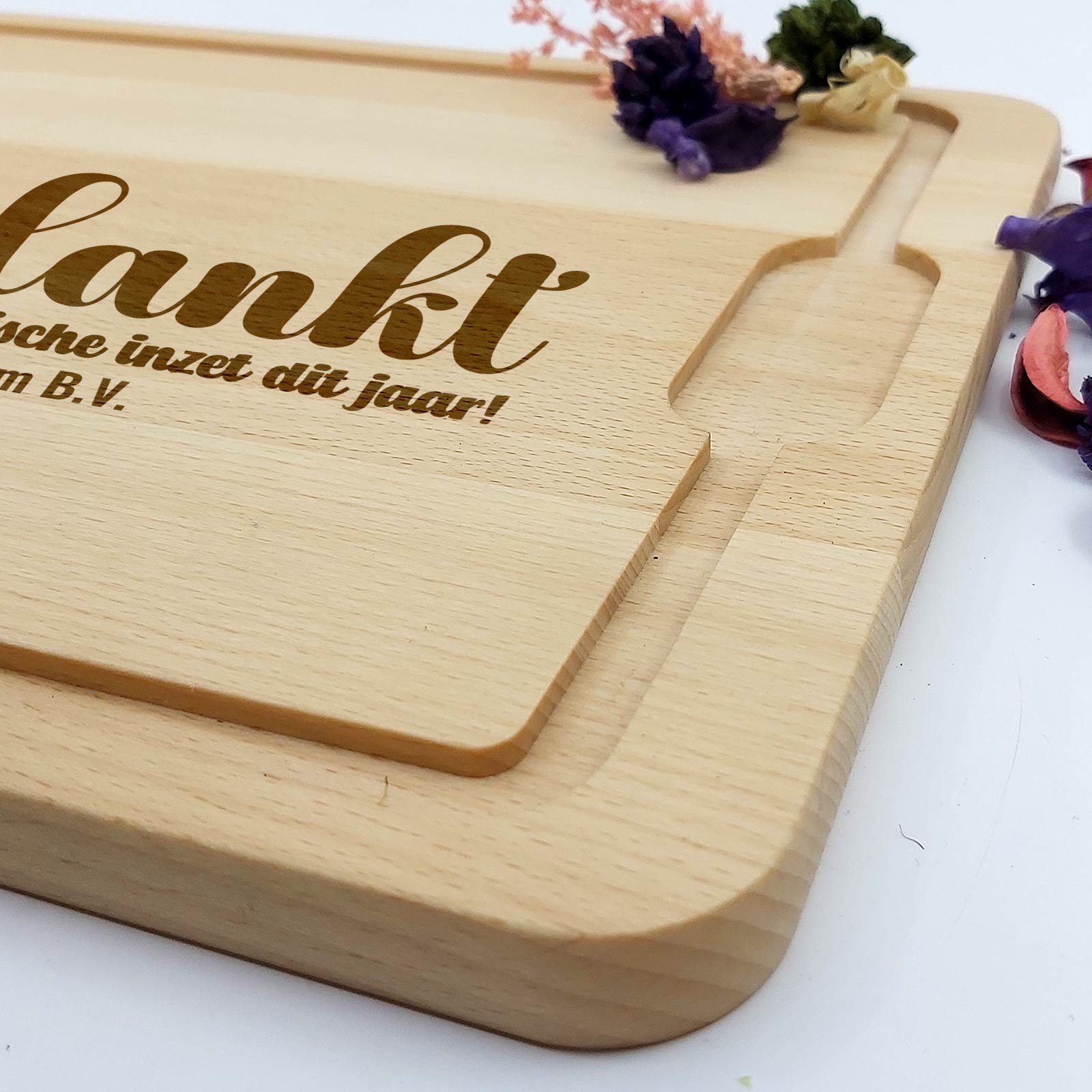 Deze Gegraveerde Hapjesplank is een echte eye-catcher. Wij gebruiken alleen hoogwaardig Europees hout. Elke hapjesplank wordt vooraf behandeld, waardoor het niet kromtrekt door vocht of temperatuurwisselingen. Deze borrelplank is zowel geschikt om op te snijden als te serveren.
