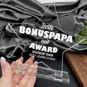 Zet jouw bonuspapa dit jaar in het zonnetje met zijn eigen award van plexiglas. Compleet gepersonaliseerd met namen van de kinderen. Een uniek cadeau!