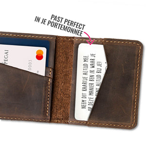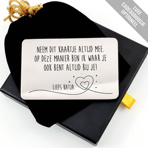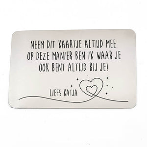 Onze RVS Kaartjes zijn perfect als kaartjes in de portemonnee of als bordje op op een deur. "Ik Ben Altijd Bij Je Stalen Kaartje" is lasergegraveerd met de hand op hoogwaardig RVS-materiaal.