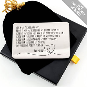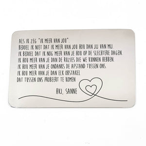 Onze RVS Kaartjes zijn perfect als kaartjes in de portemonnee of als bordje op op een deur. "Als Ik Zeg Ik Meer Van Jou... Stalen Kaartje" is lasergegraveerd met de hand op hoogwaardig RVS-materiaal.