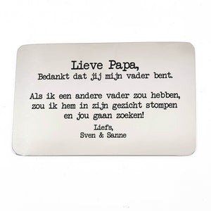 Onze RVS Kaartjes zijn perfect als kaartjes in de portemonnee of als bordje op op een deur. "Bedankt Dat Jij Mijn Papa Bent Stalen Kaartje" is lasergegraveerd met de hand op hoogwaardig RVS-materiaal.