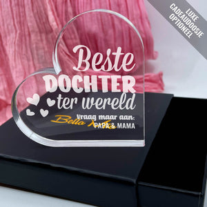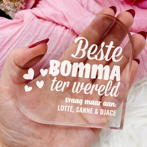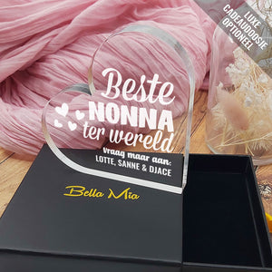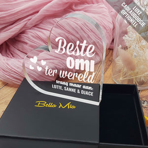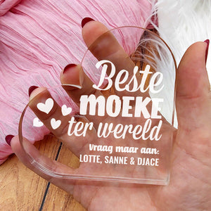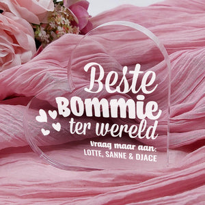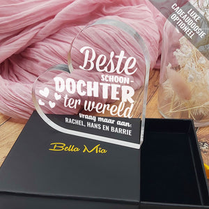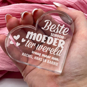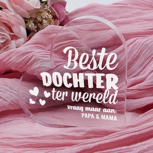Doe vandaag nog een prachtig plexiglas hart met persoonlijke boodschap cadeau. Lasergegraveerd met eigen namen en een dikte van 1 cm.