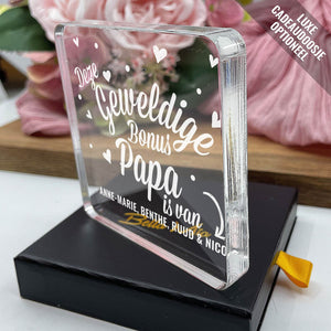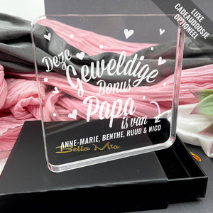 Doe vandaag nog een prachtig plexiglas Aandenken met persoonlijke boodschap cadeau. Lasergegraveerd met eigen namen en een dikte van 1 cm.