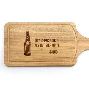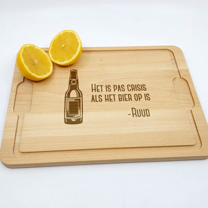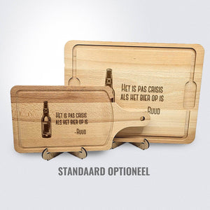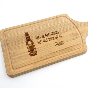 Let op: Hout is een natuurproduct. Hierdoor zal elke gravure iets afwijken van de foto's. Dit komt simpelweg omdat de nerf van het hout bepaald hoe donker de gravure wordt. Dit maakt elke borrelplank wel 100% uniek!