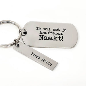 Zijn jullie die ene stel knuffelkonten die heerlijk naakt in bed ligt te knuffelen? Of zijn jullie stiekem wel meer dan alleen maar aan het knuffelen? Laat je geliefde weten dat je maar al te graag naakt wilt knuffelen samen en geef deze originele 'Ik wil met je knuffelen. Naakt!' sleutelhanger cadeau. Je kunt de RVS sleutelhanger personaliseren door er jouw naam aan toe te laten voegen.