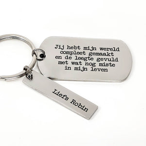 Na jarenlang gezocht te hebben naar iets wat de leegte in je leven zou vullen, heb je het eindelijk gevonden. Je partner... Laat je partner weten dat je er zo over denkt en geef nu deze 'jij hebt mijn wereld compleet gemaakt en de leegte gevuld met wat nog miste in mijn leven' RVS sleutelhanger cadeau. Dit originele cadeau kan je personaliseren door er je naam aan toe te laten voegen. Deze boodschap met jouw naam zal je partner altijd bij zich kunnen dragen!