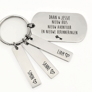 Nieuw Huis, Nieuw avontuur en nieuwe herinneringen Sleutelhanger. Op veler verzoek is het nu mogelijk om ook een eigen tekst op de dogtag te zetten. Wie ga jij verrassen met deze unieke gepersonaliseerde sleutelhanger?