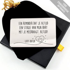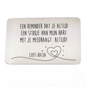 Onze RVS Kaartjes zijn perfect als kaartjes in de portemonnee of als bordje op op een deur. "Stukje Van Mijn Hart Stalen Kaartje" is lasergegraveerd met de hand op hoogwaardig RVS-materiaal.