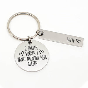 Dat zoveel liefde wordt samengevoegd door het officieel te maken en te trouwen is een wonderlijk event. Geef je geliefde de '2 Harten worden 1, vanaf nu, nooit meer alleen' sleutelhanger cadeau en laat haar/hem weten dat je voor altijd van diegene zal houden! Personaliseer de sleutelhanger door er jouw naam aan toe te voegen zodat je geliefde jou altijd bij zich kan dragen.