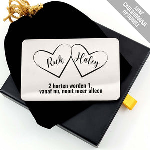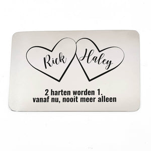 Onze RVS Kaartjes zijn perfect als kaartjes in de portemonnee of als bordje op op een deur. "2 Harten Worden 1 Vanaf Nu Nooit Meer Alleen Stalen Kaartje" is lasergegraveerd met de hand op hoogwaardig RVS-materiaal.