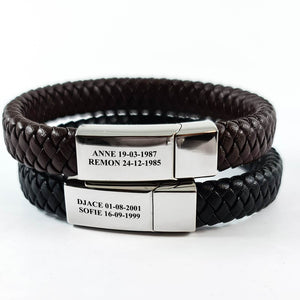 De armbanden zijn met de hand op maat gemaakt. Maak het perfecte gepersonaliseerde Cadeau met maximal 4 namen. Lengte van de armband: 21.5cm Onze armbanden zijn verkrijgbaar in bruin en zwart leer.