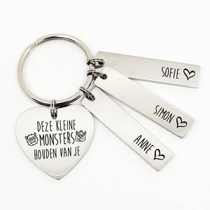 Monsters zijn het! Maar wel monsters die van je houden... Of ben jij het gruwelijke monster die van zijn of haar ouders houdt? Dan is deze 'Deze kleine monsters houden van je' sleutelhanger een super leuk cadeau om te geven. Laat je mama of papa weten dat je van ze houdt ondanks al je kattenkwaad en geef deze mooie RVS sleutelhanger cadeau. Je kunt de sleutelhanger personaliseren door er de namen van alle kinderen aan toe te voegen.
