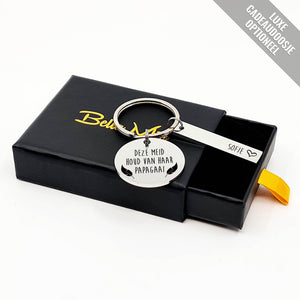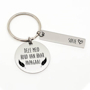 Papagaaien binden zich ontzettend veel aan hun eigenaar, maar wie zegt dat de eigenaar niet ook ontzettend veel van de papagaaien houdt? 'Deze meid houd van haar papagaai' sleutelhanger bewijst hoeveel dat is! Verras jezelf of een ander met dit originele cadeau, die je kan personaliseren door de naam van de vogel of van de papagaai liefhebber aan de sleutelhanger toe te laten voegen