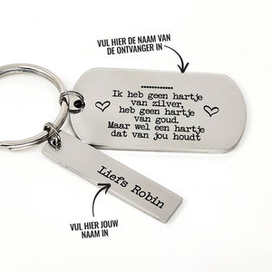 Ik heb geen hartje van zilver,heb geen hartje van goud. Maar wel een hartje dat van jou houdt RVS sleutelhanger. Op veler verzoek is het nu mogelijk om ook een eigen tekst op de dogtag te zetten. Wie ga jij verrassen met deze unieke gepersonaliseerde sleutelhanger?