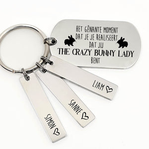 Ben jij ook zo Gek op konijnen dat de buurt jou ziet als het konijnen vrouwtje? dan is deze Handgemaakte Rvs Sleutelhanger echt iets voor jou! je kan de sleutelhanger zelfs personaliseren met de namen van jou konijnen!