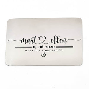 Onze RVS Kaartjes zijn perfect als kaartjes in de portemonnee of als bordje op op een deur. "Huwelijk 2 Namen Plus Datum Stalen Kaartje" is lasergegraveerd met de hand op hoogwaardig RVS-materiaal.